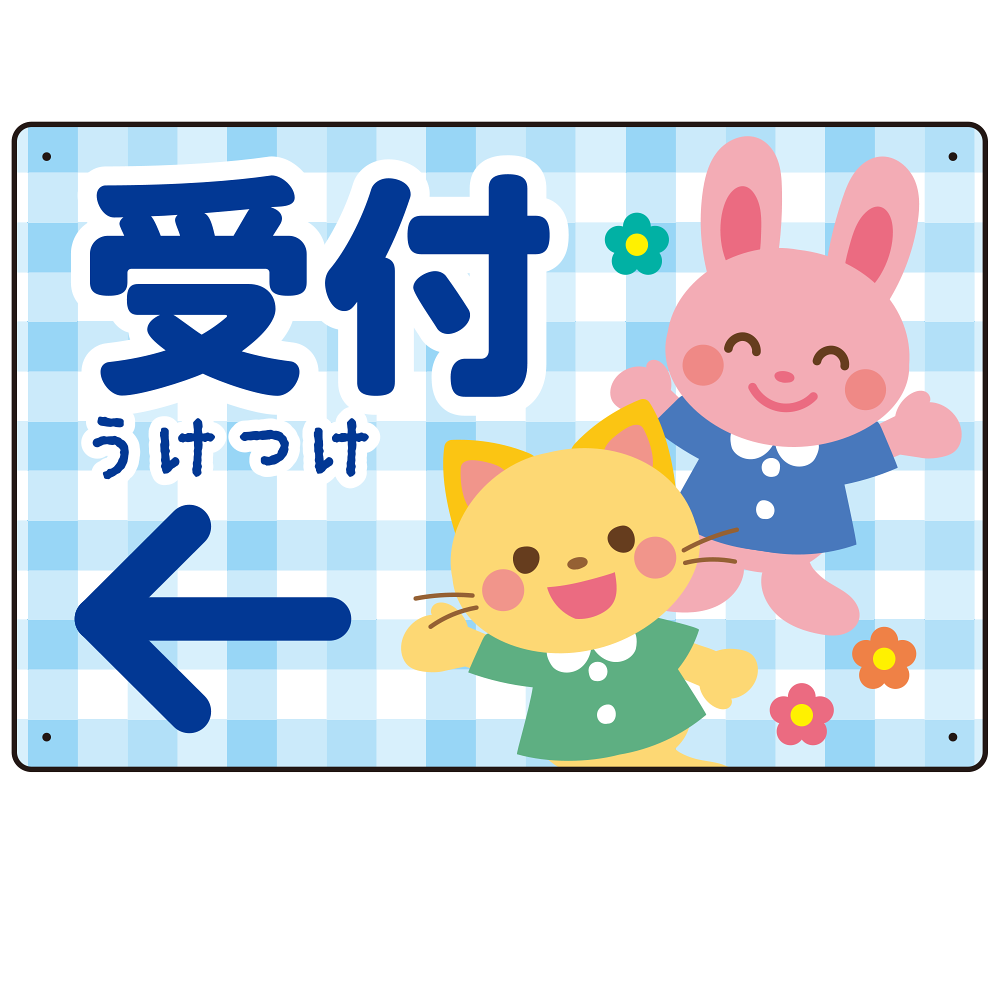 - やさしいチェック柄が親しみやすい印象を与え、ふりがなの「うけつけ」表記が小さなお子さまにもわかりやすいデザインとなっています。