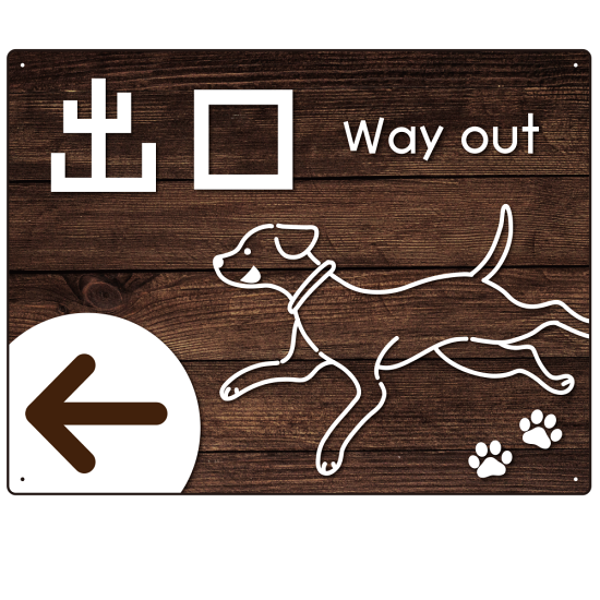 商品説明:ペット施設向け 木目調案内板 オリジナルプレート看板 出口/左矢印 W600×H450 エコユニボード(SP-SMD798BL-60x45U)