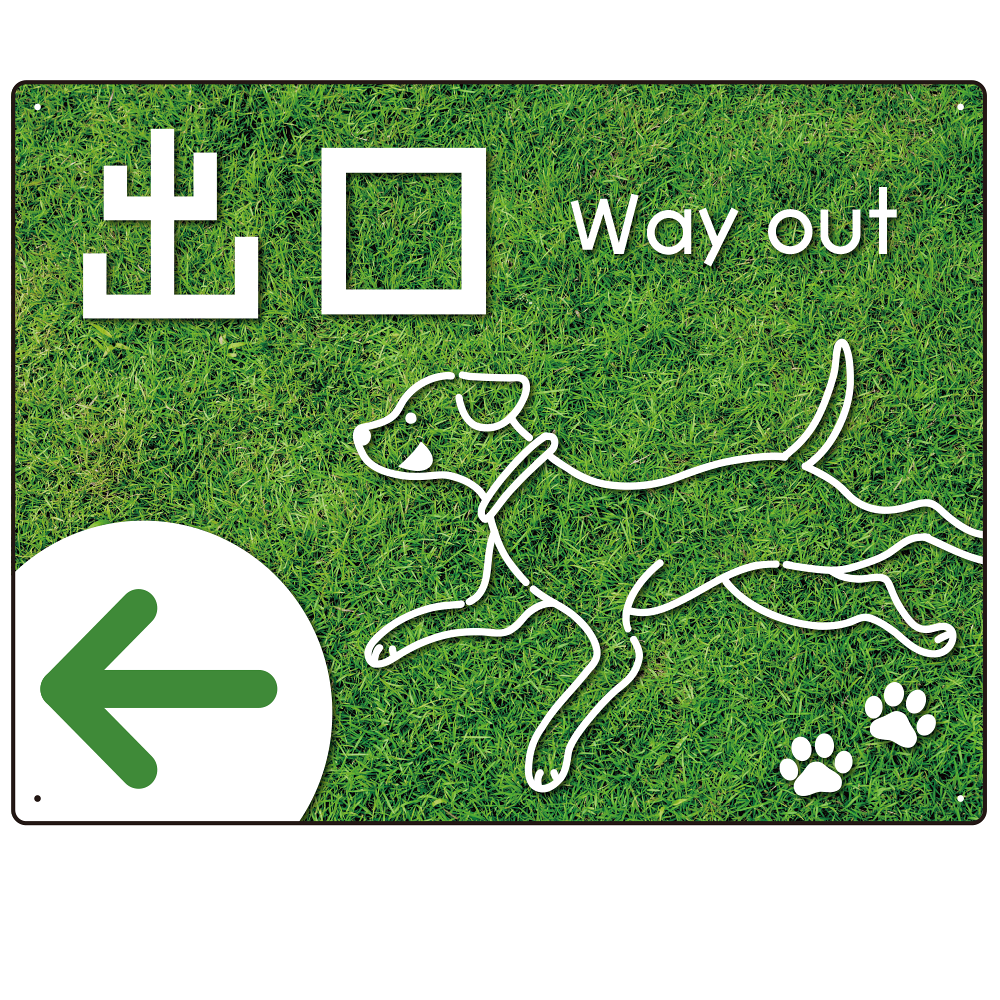 商品説明:ペット施設向け グリーンフィールド風案内板 オリジナルプレート看板 出口/左矢印 W600×H450 エコユニボード(SP-SMD799BL-60x45U)