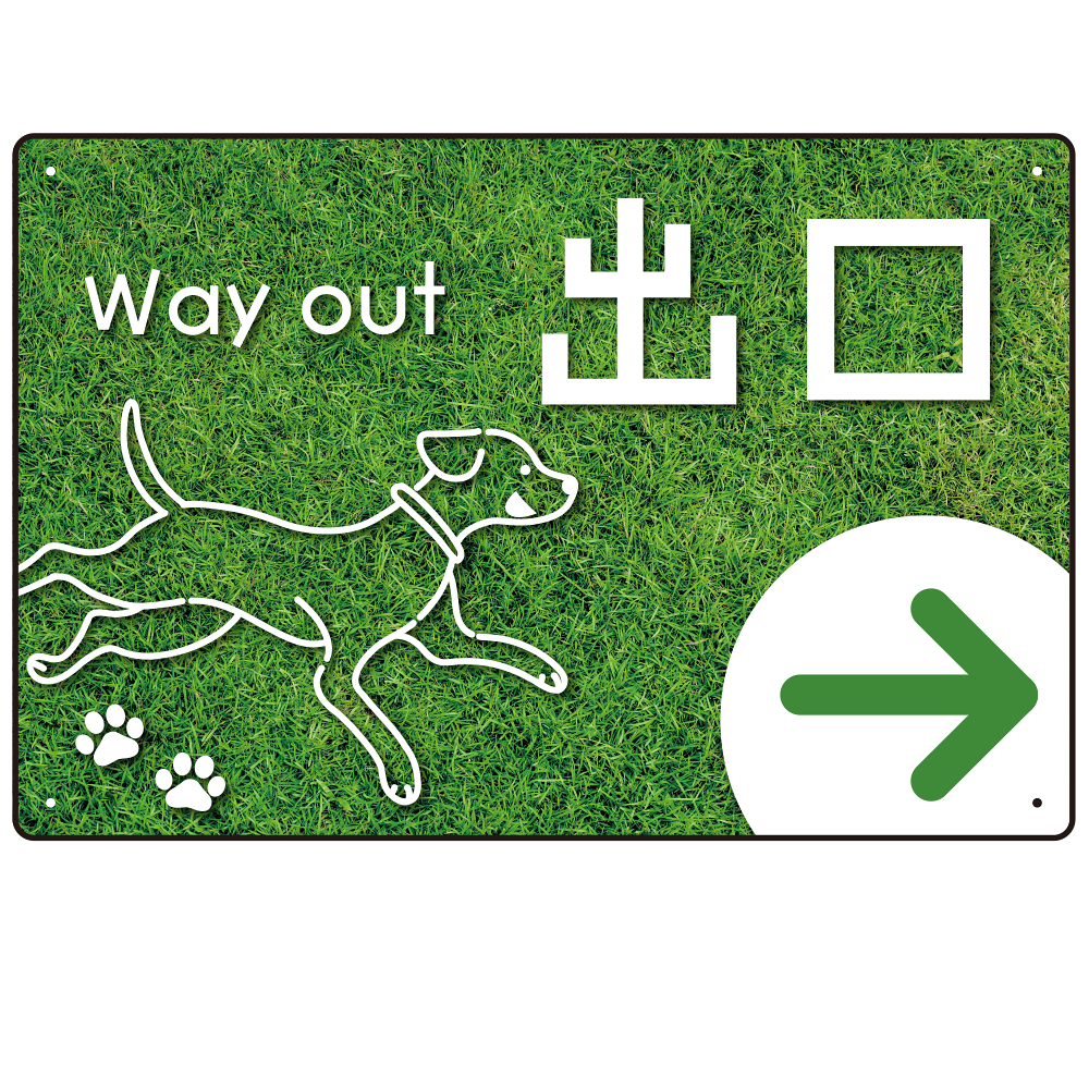 商品説明:ペット施設向け グリーンフィールド風案内板 オリジナルプレート看板 出口/右矢印 W450×H300 エコユニボード(SP-SMD799BR-45x30U)