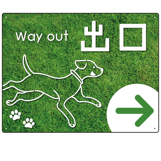 商品説明:ペット施設向け グリーンフィールド風案内板 オリジナルプレート看板 出口/右矢印 W600×H450 エコユニボード(SP-SMD799BR-60x45U)