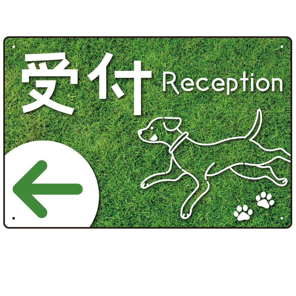 ペット施設向け グリーンフィールド風案内板 オリジナルプレート看板 受付/左矢印 W450×H300 エコユニボード(SP-SMD799CL-45x30U)