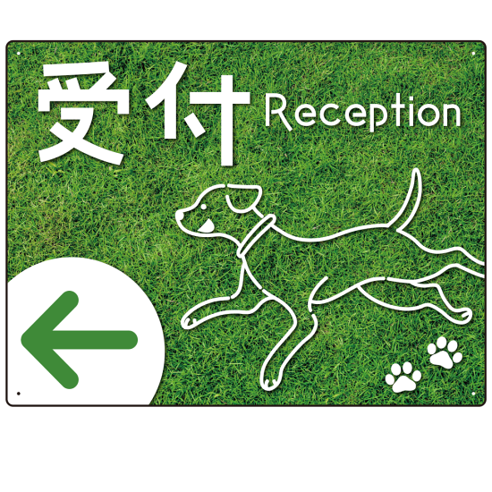 ペット施設向け グリーンフィールド風案内板 オリジナルプレート看板 受付/左矢印 W600×H450 エコユニボード(SP-SMD799CL-60x45U)