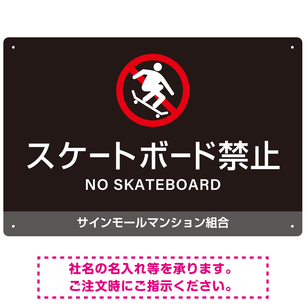 - マンション敷地内や商業施設などでのスケートボード利用を禁止することを明確に伝える看板です。