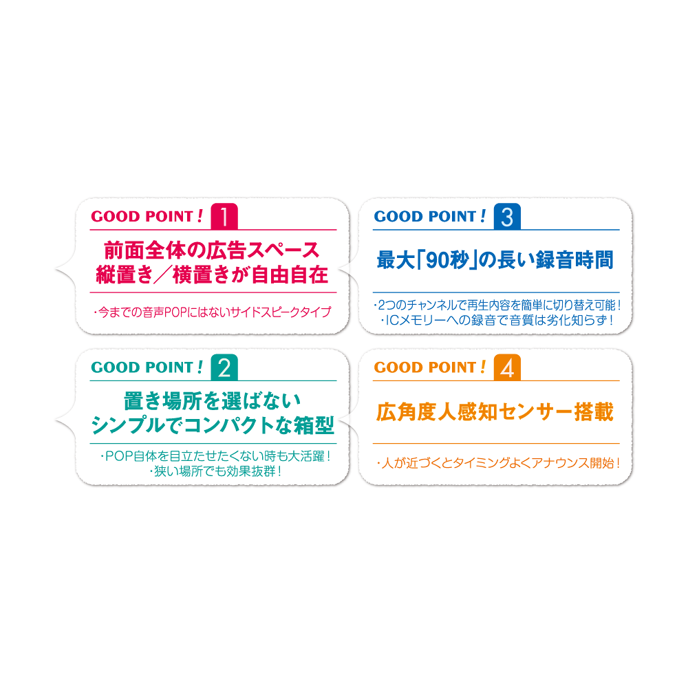 - 従来の前面から音声が流れるタイプではなく、サイドから音が出る音声POPですので広告の裏に隠して使用しても、音声出力の穴を塞がず、音質が変わりません。