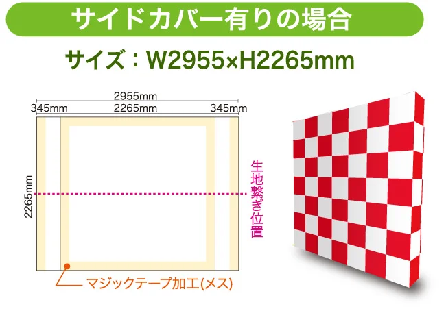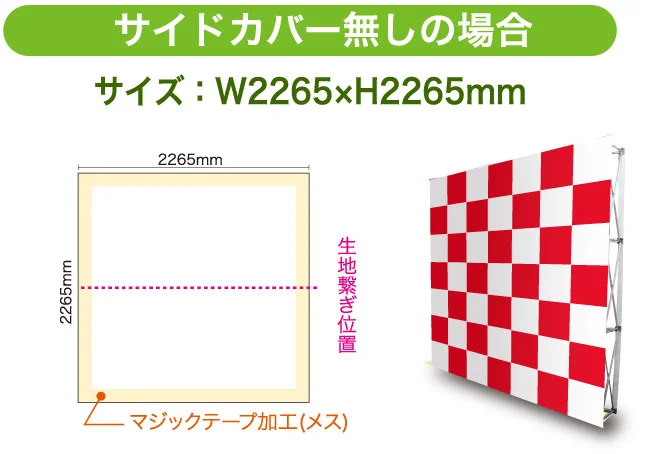- つなぎ目の不要な1枚布印刷もご用意しております。センターにつなぎ目を入れたくないビジュアルの場合、こちらの1枚布がオススメです。