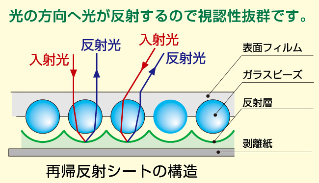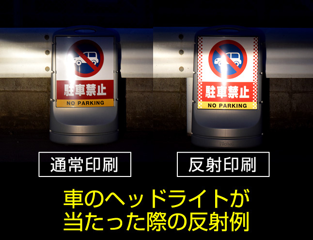 - 「反射出力」は光が当たると反射して見える特殊な反射材の上に印刷・ラミネート加工を行う方法です。車のヘッドライトなどが当たると表示面が光を反射して夜間でもよく目立ちます。