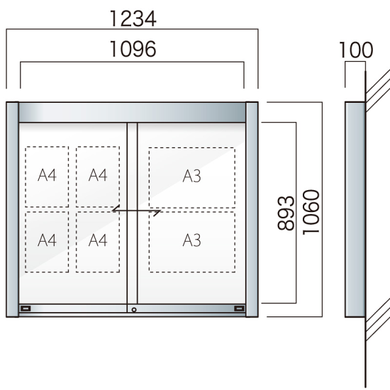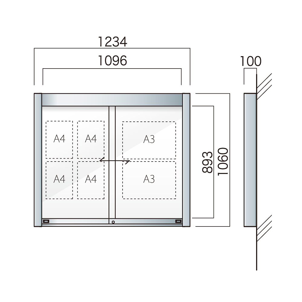 商品説明:壁付アルミ掲示板 AGP-1210W(幅1234mm) 照明なし シルバーつや消し AGP-1210W(S)