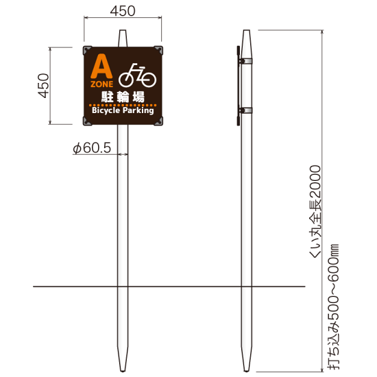 - ■打ち込み杭には、「くい丸」を採用。くい丸の予測耐久年数は約8年~30年の高耐久性。一般の鋼材を使用した各種サインと同等以上の耐久性です。