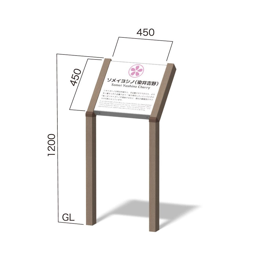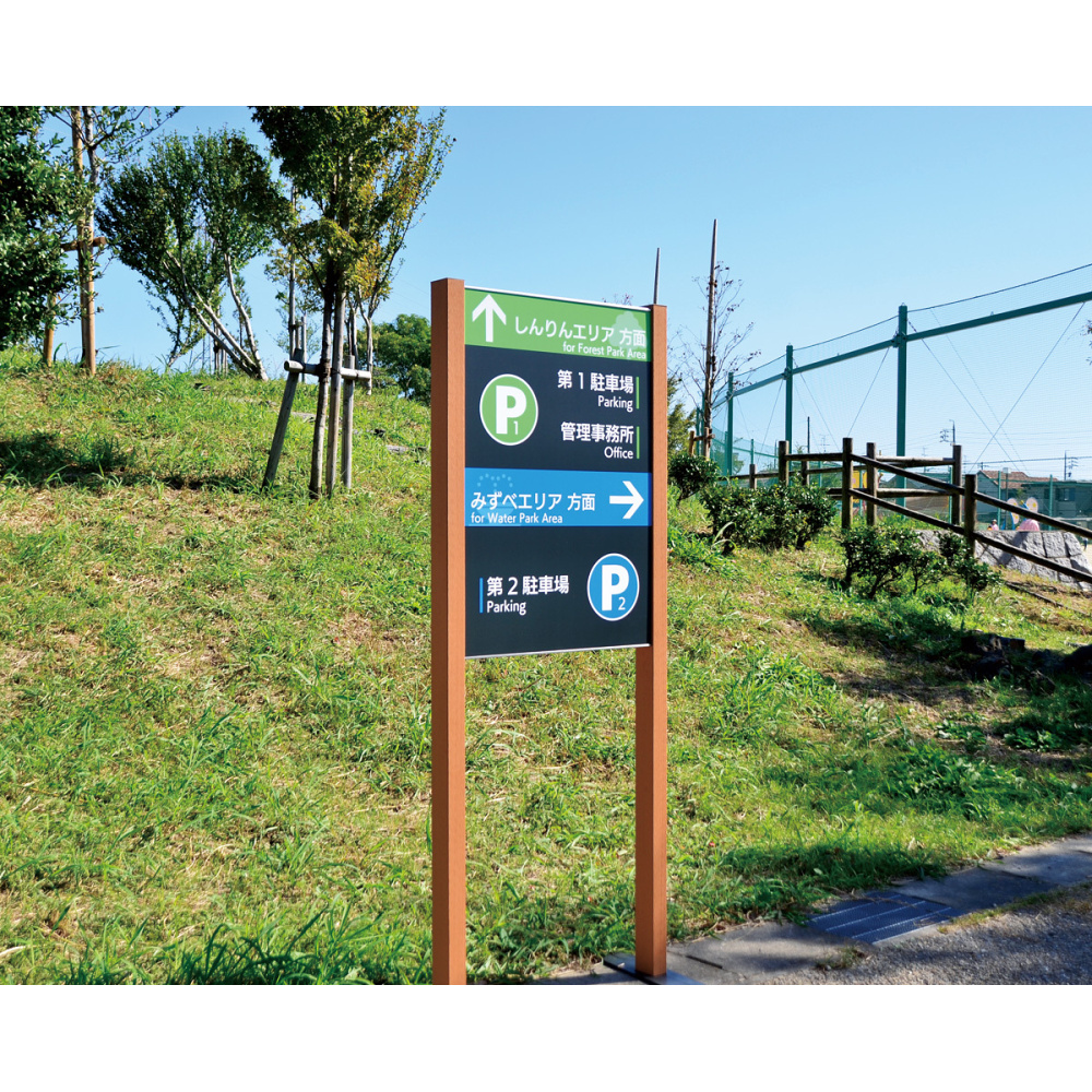 - 再生木材を使用したナチュラル系の自立看板。自然に馴染み景観を損なわないサイン・インフォメーションを提供します。