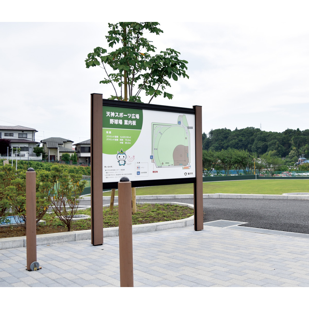 建築廃材や間伐材を粉砕しプラスチックと混合して押出成型した再生木材を利用した和風自立看板