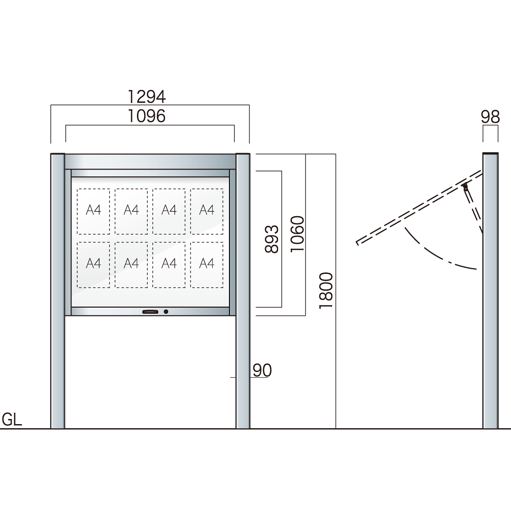 跳ね上げ式自立アルミ掲示板 AGS-1210(幅1294mm) LED付 シルバーつや消し AGS-1210(LED-S)