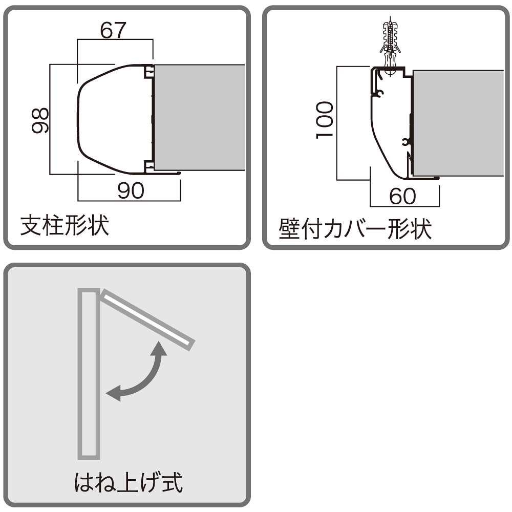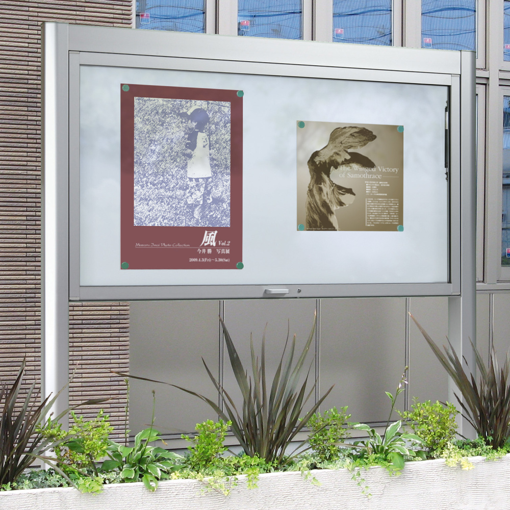 - 掲示面を下からはね上げるタイプの掲示板。設置場所を選ばないシックなデザインが人気です。
