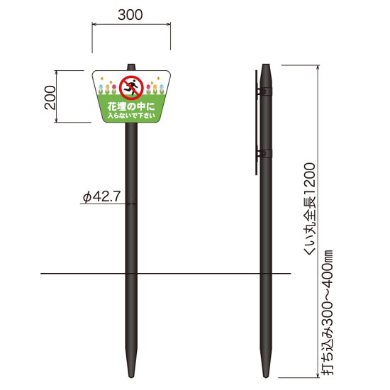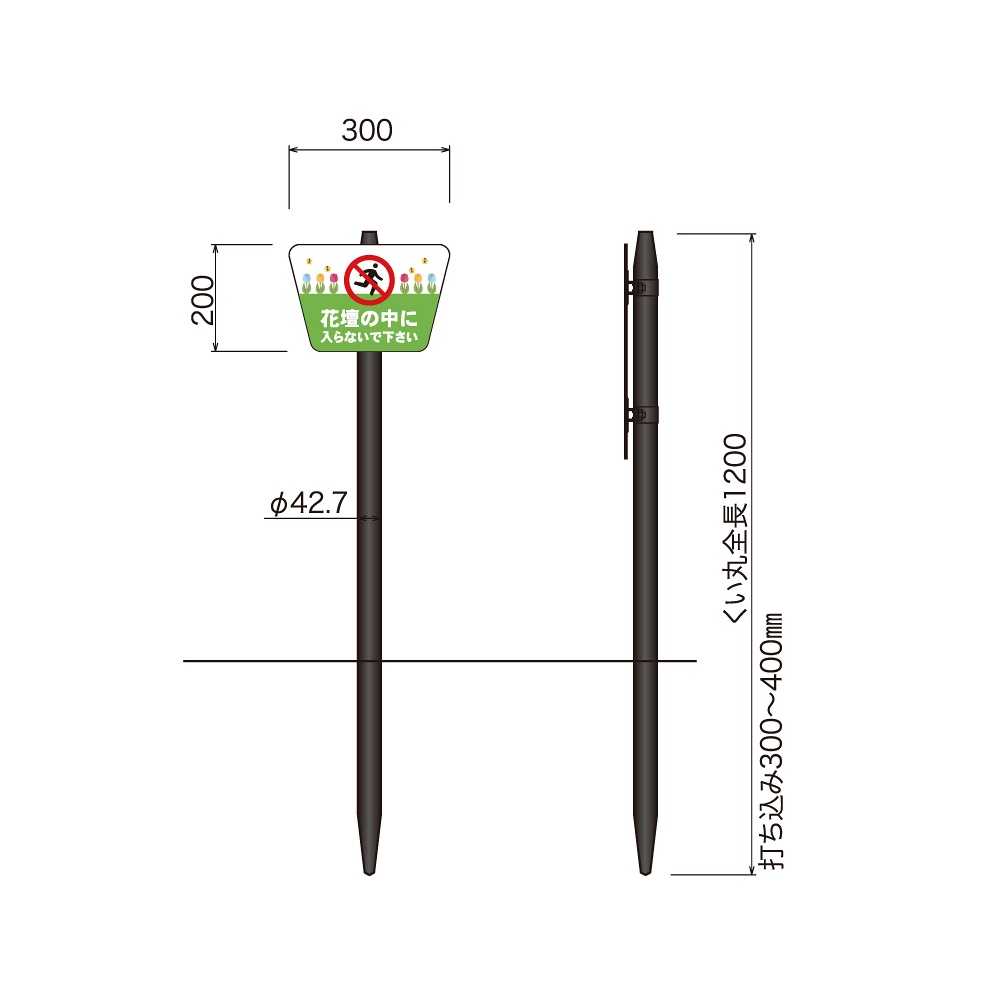 - ■打ち込み杭には、「くい丸」を採用。くい丸の予測耐久年数は約8年~30年の高耐久性。一般の鋼材を使用した各種サインと同等以上の耐久性です。