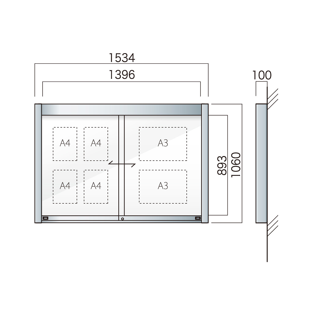商品説明:壁付アルミ掲示板 AGP-1510W(幅1534mm) 照明なし シルバーつや消し AGP-1510W(S)