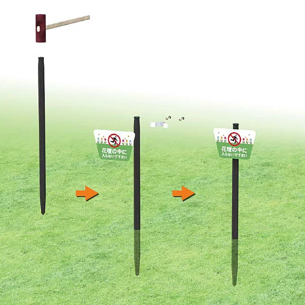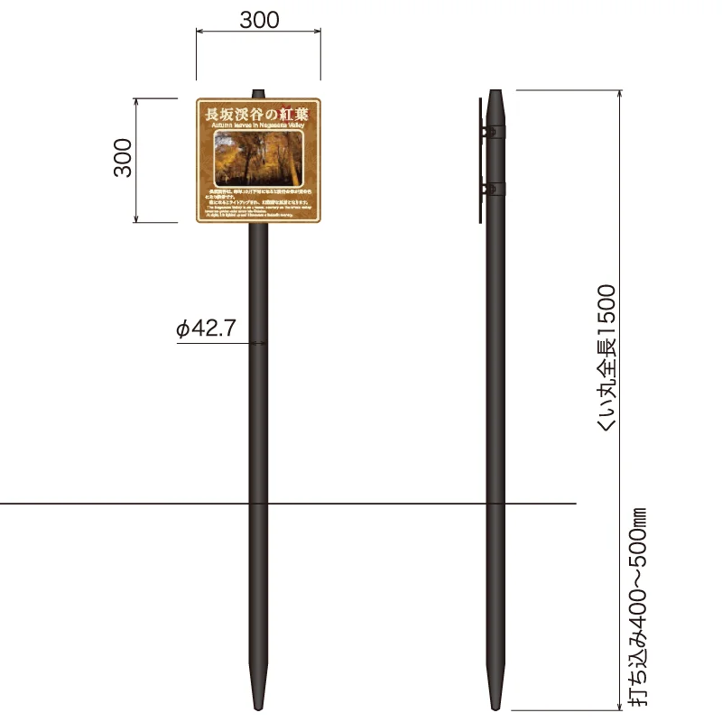 - ■打ち込み杭には、「くい丸」を採用。くい丸の予測耐久年数は約8年~30年の高耐久性。一般の鋼材を使用した各種サインと同等以上の耐久性です。