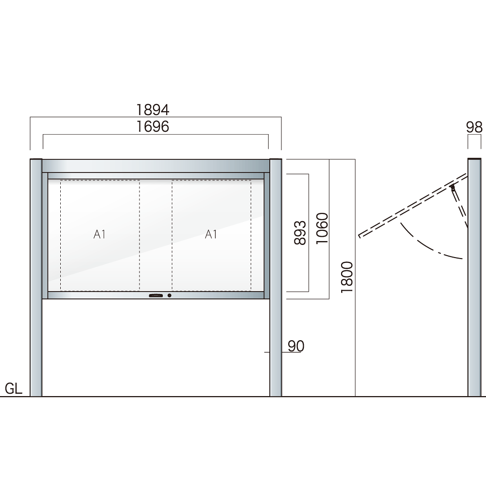 跳ね上げ式自立アルミ掲示板 AGS-1810(幅1894mm) 照明なし シルバーつや消し AGS-1810(S)