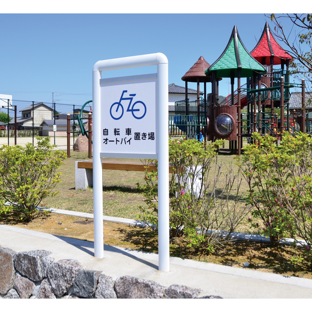 - たまご型の優しい印象を与える支柱を採用した自立看板。