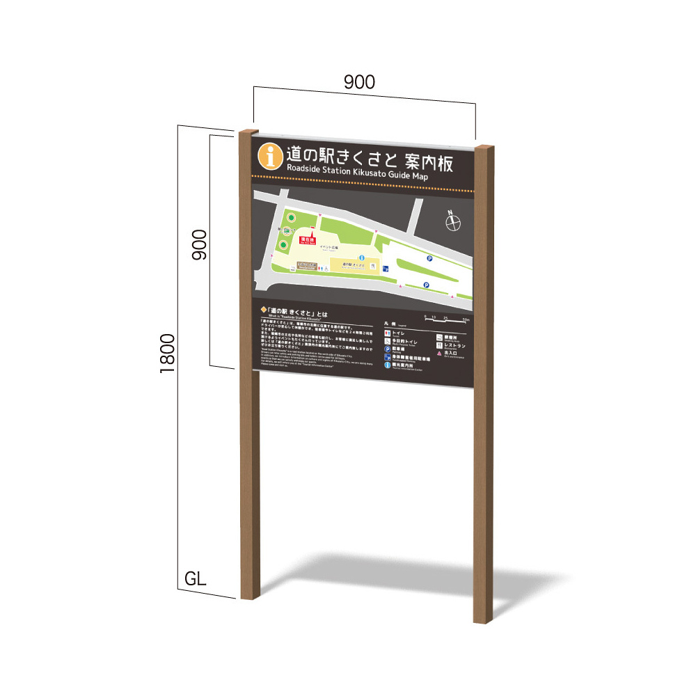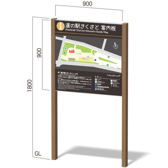 - 再生木材を使用したナチュラル系の自立看板。自然に馴染み景観を損なわないサイン・インフォメーションを提供します。