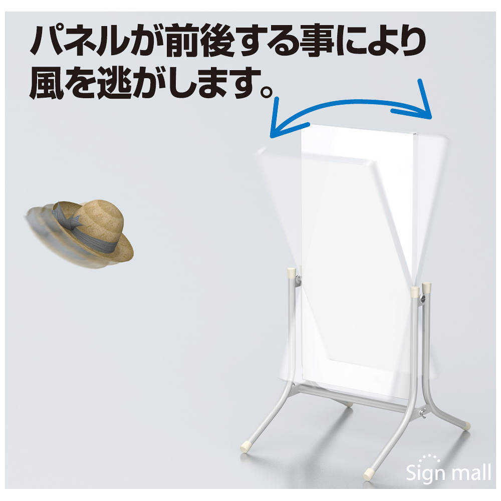 - ボード(パネル)がスイングすることで風を逃し、看板が転倒するのを防ぎます。