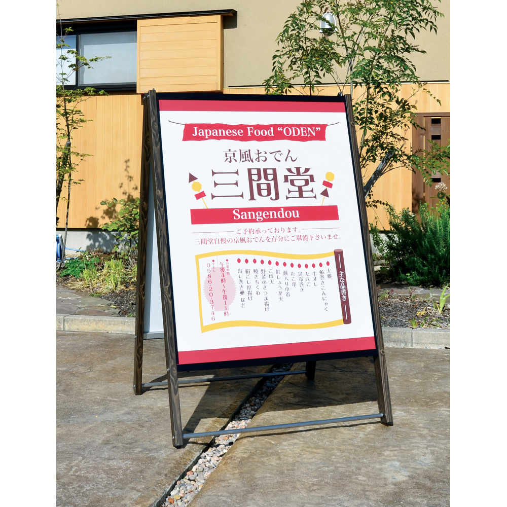 木目調シートでラッピングした和風A型看板。出力シートをボードに貼り込むタイプです。