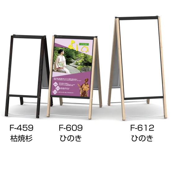 - シルバーやブラックが多いA型看板の中でひときわ目立つ木目調のA型看板。