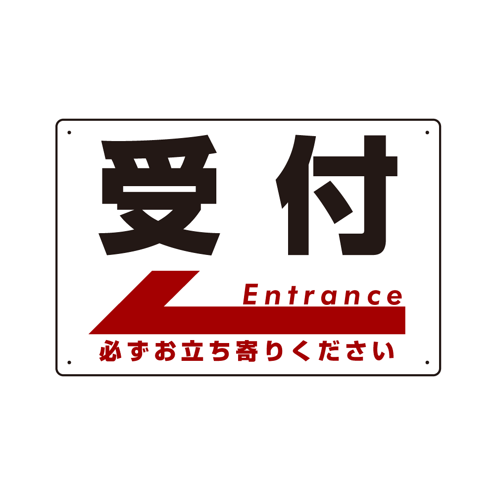 - シンプルで分かりやすい「受付」の文字と矢印の組み合わせに、「必ずお立ち寄りください」を併記。様々な施設でご利用いただけます。
