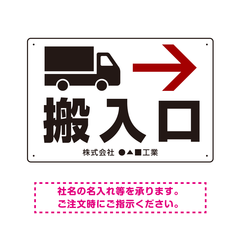 - トラックのイラストマークに矢印を付けたシンプルで分かりやすい「搬入口」表示プレート。白黒デザインでくっきり見やすいデザインです。