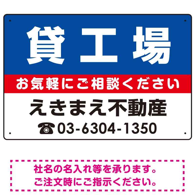 「貸工場 オリジナル プレート看板 青背景 W450×H300 エコユニボード (SP-SMD222-45x30U)」の導入をご検討中ですか? 大量注文・複数台のご検討に応じたお見積りのご相談、最短納期や送料、仕様・サイズの確認など、 不動産定番デザインプレート看板選びをまとめてサポートいたします。
