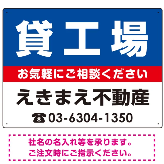 「貸工場 オリジナル プレート看板 青背景 W600×H450 エコユニボード (SP-SMD222-60x45U)」の導入をご検討中ですか? 大量注文・複数台のご検討に応じたお見積りのご相談、最短納期や送料、仕様・サイズの確認など、 不動産定番デザインプレート看板選びをまとめてサポートいたします。