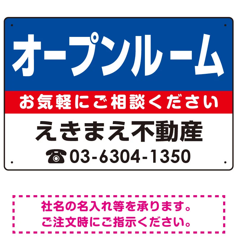 「オープンルーム オリジナル プレート看板 青背景 W450×H300 エコユニボード (SP-SMD230-45x30U)」の導入をご検討中ですか? 大量注文・複数台のご検討に応じたお見積りのご相談、最短納期や送料、仕様・サイズの確認など、 不動産定番デザインプレート看板選びをまとめてサポートいたします。