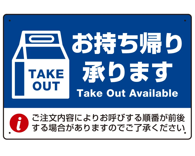 紙袋風のイラストがポイントのお持ち帰り承ります表示プレート。