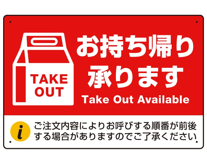 紙袋風のイラストがポイントのお持ち帰り承ります表示プレート。