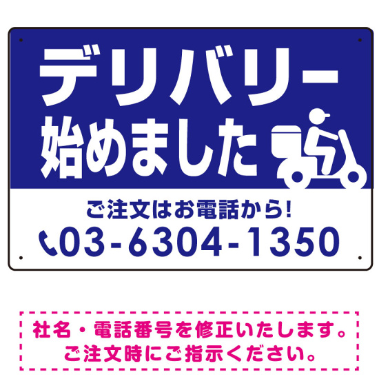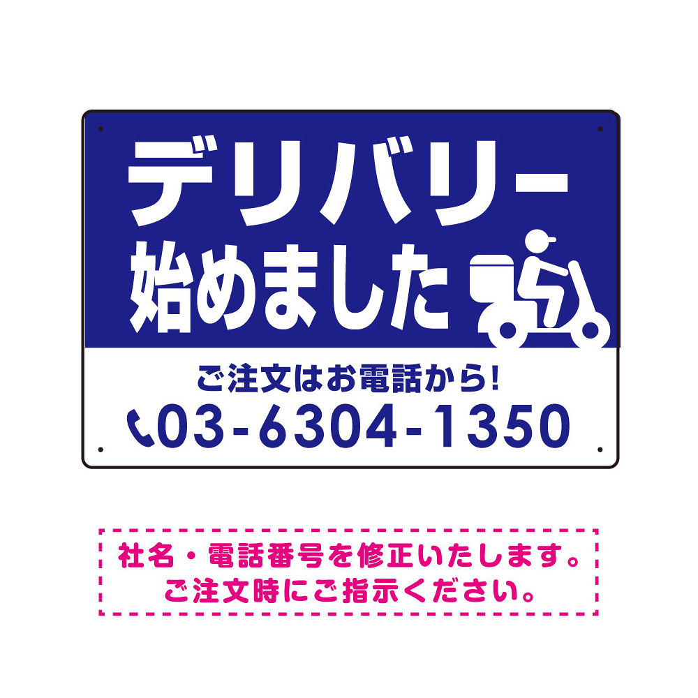 商品説明:デリバリー始めました バイク配達イラスト付 オリジナルプレート看板 ブルー W450×H300 エコユニボード (SP-SMD365-45x30U)