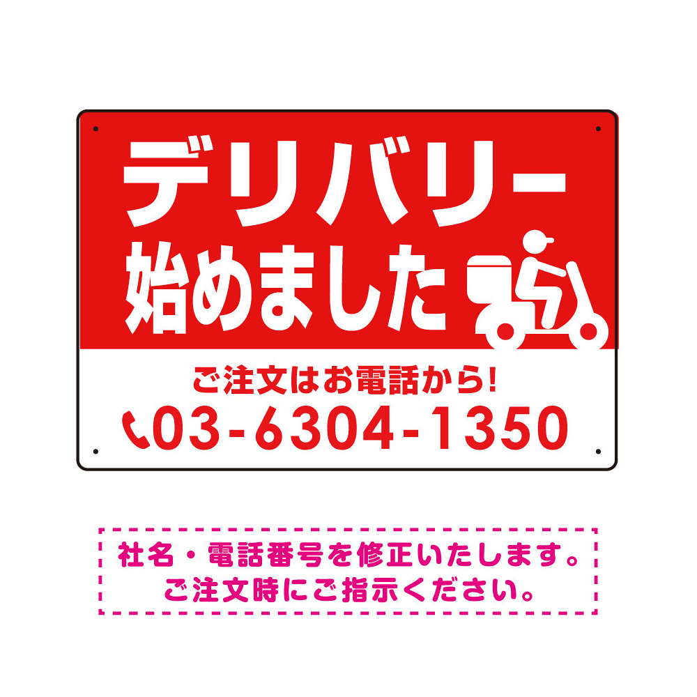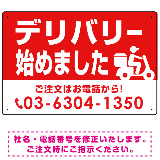 商品説明:デリバリー始めました バイク配達イラスト付 オリジナルプレート看板 レッド W450×H300 エコユニボード (SP-SMD357-45x30U)
