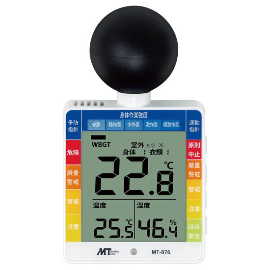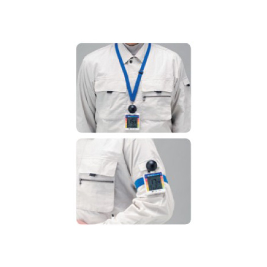 - 室内外、衣類の種類、作業内容を設定することで熱中症の危険性をWBGT表示とアラームでお知らせ!