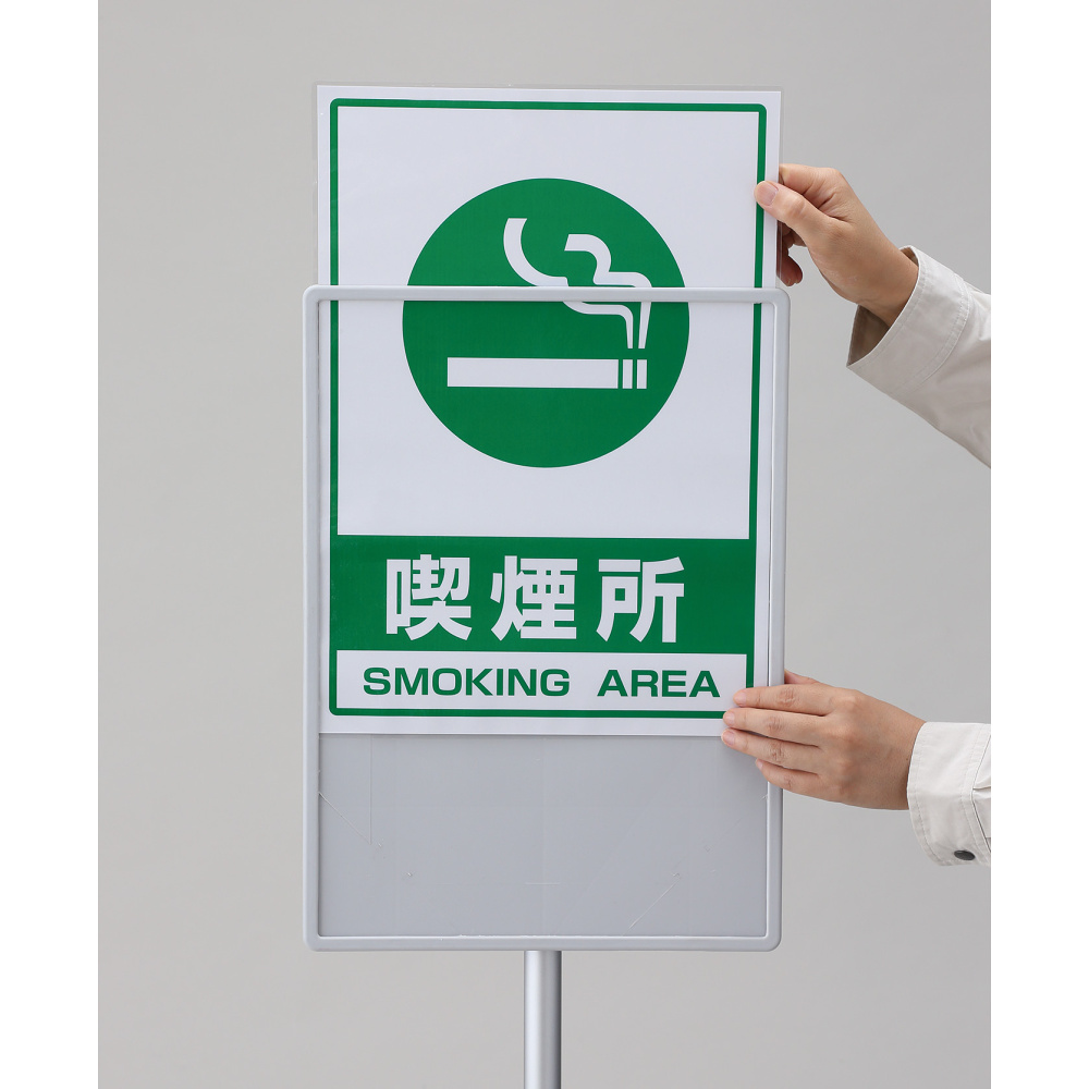 - ラミネート加工を施した表示物をフレーム上部から差し込むだけで簡単に掲示できる表示スタンド。