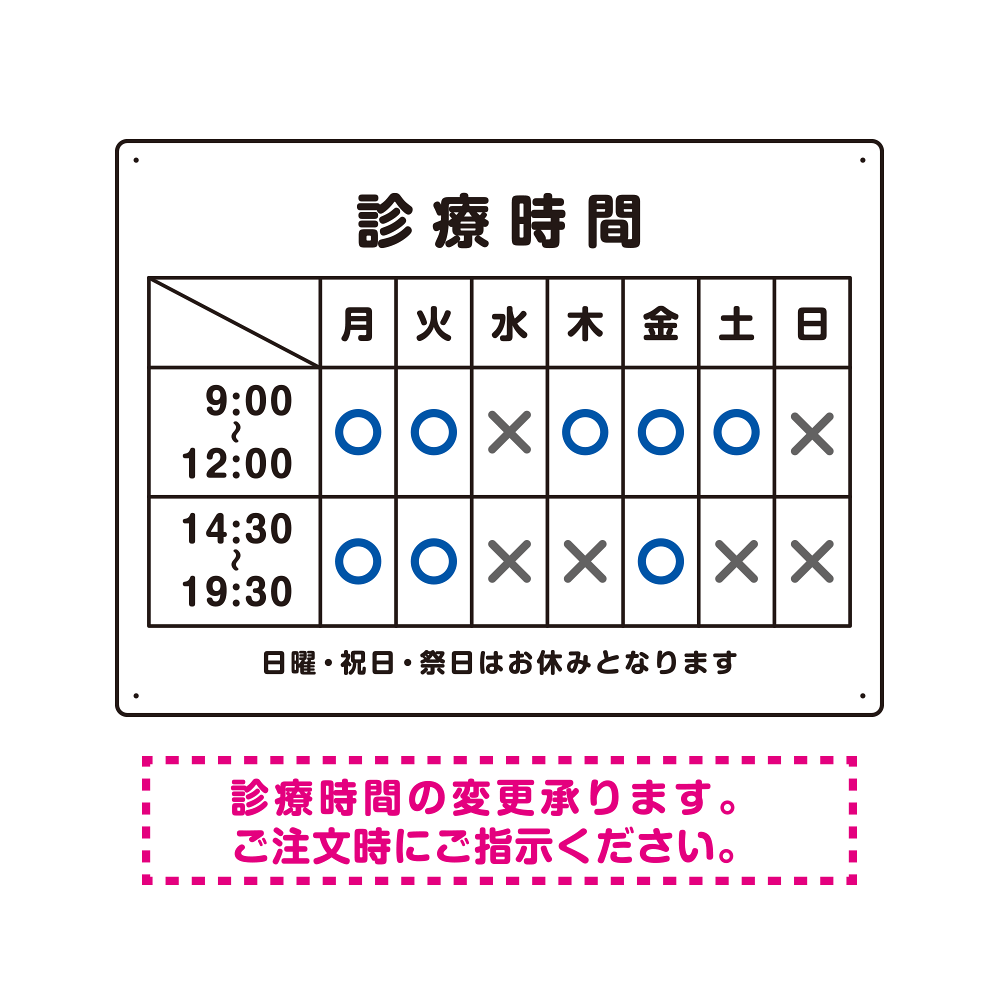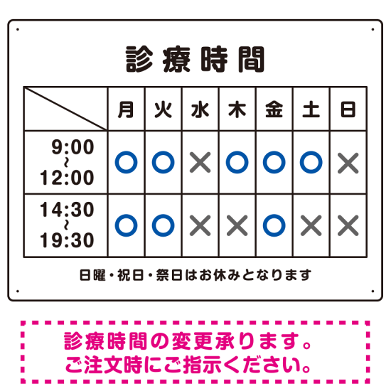 - 病院や歯科・クリニックに最適な診療時間案内デザインテンプレート看板。1から作ると高くなってしまう看板もテンプレートをご利用いただくことで安価に簡単にお作りいただけます。