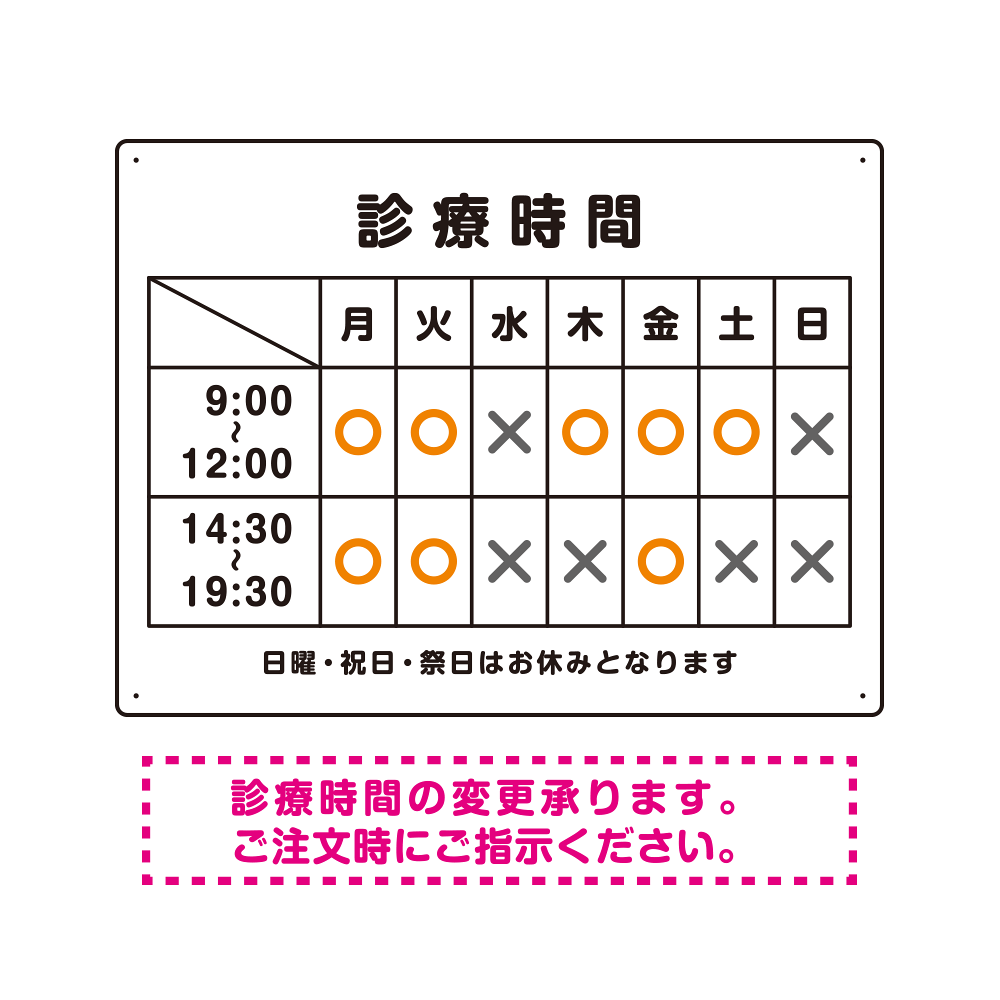 診療時間案内 白基調 病院・クリニック向けプレート看板 オレンジ W600×H450 エコユニボード