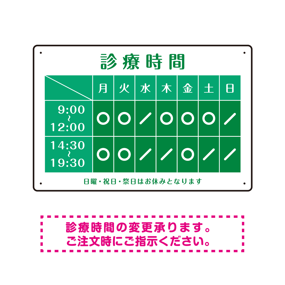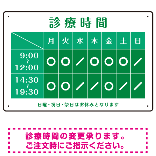 診療時間案内 カラーデザイン 病院・クリニック向けプレート看板 グリーン W450×H300 エコユニボード