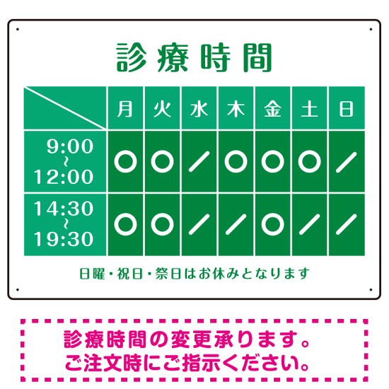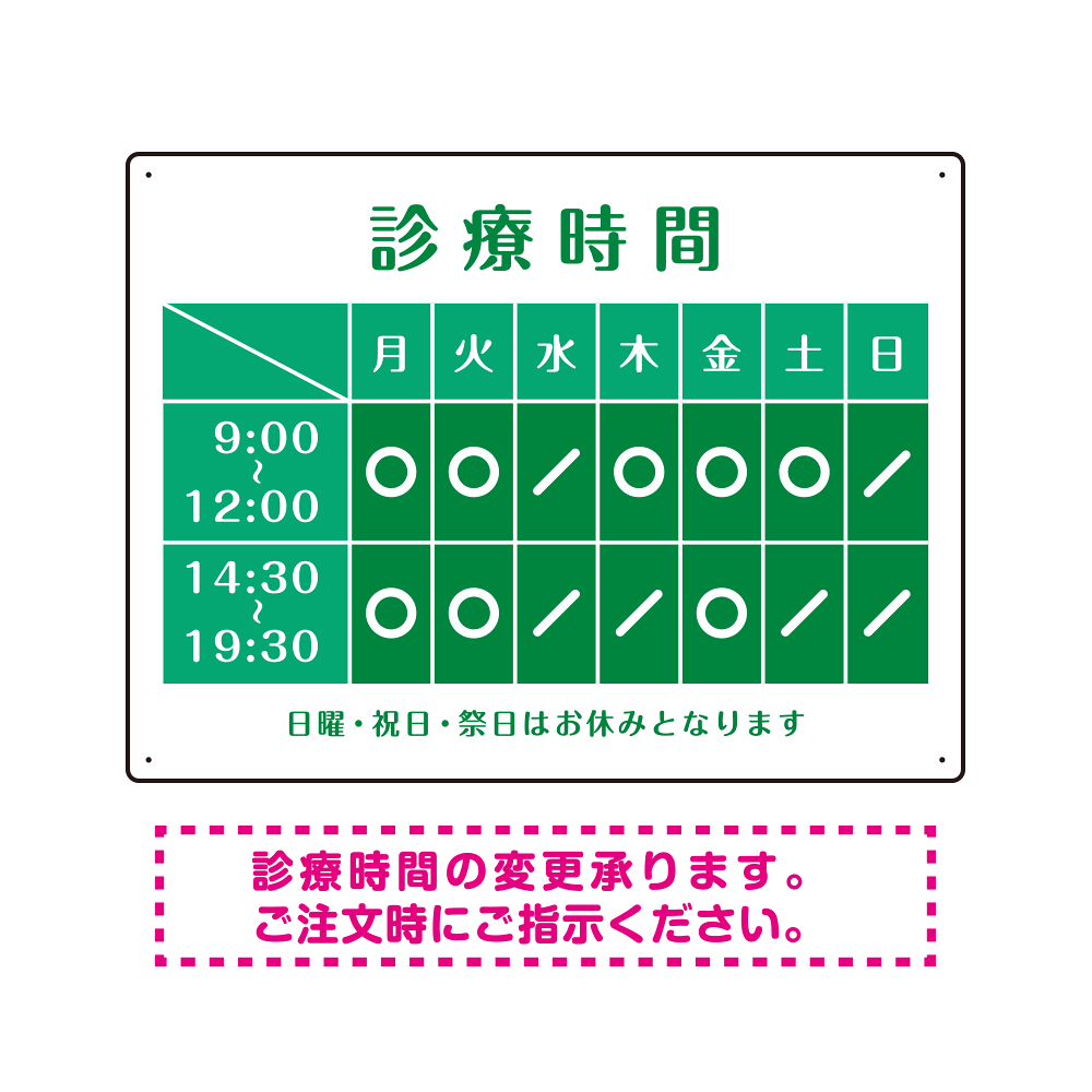 診療時間案内 カラーデザイン 病院・クリニック向けプレート看板 グリーン W600×H450 エコユニボード