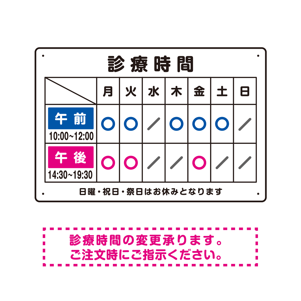 - 病院や歯科・クリニックに最適な診療時間案内デザインテンプレート看板。1から作ると高くなってしまう看板もテンプレートをご利用いただくことで安価に簡単にお作りいただけます。