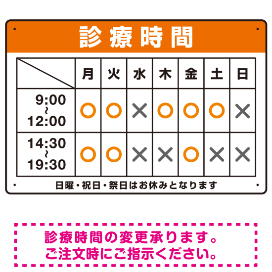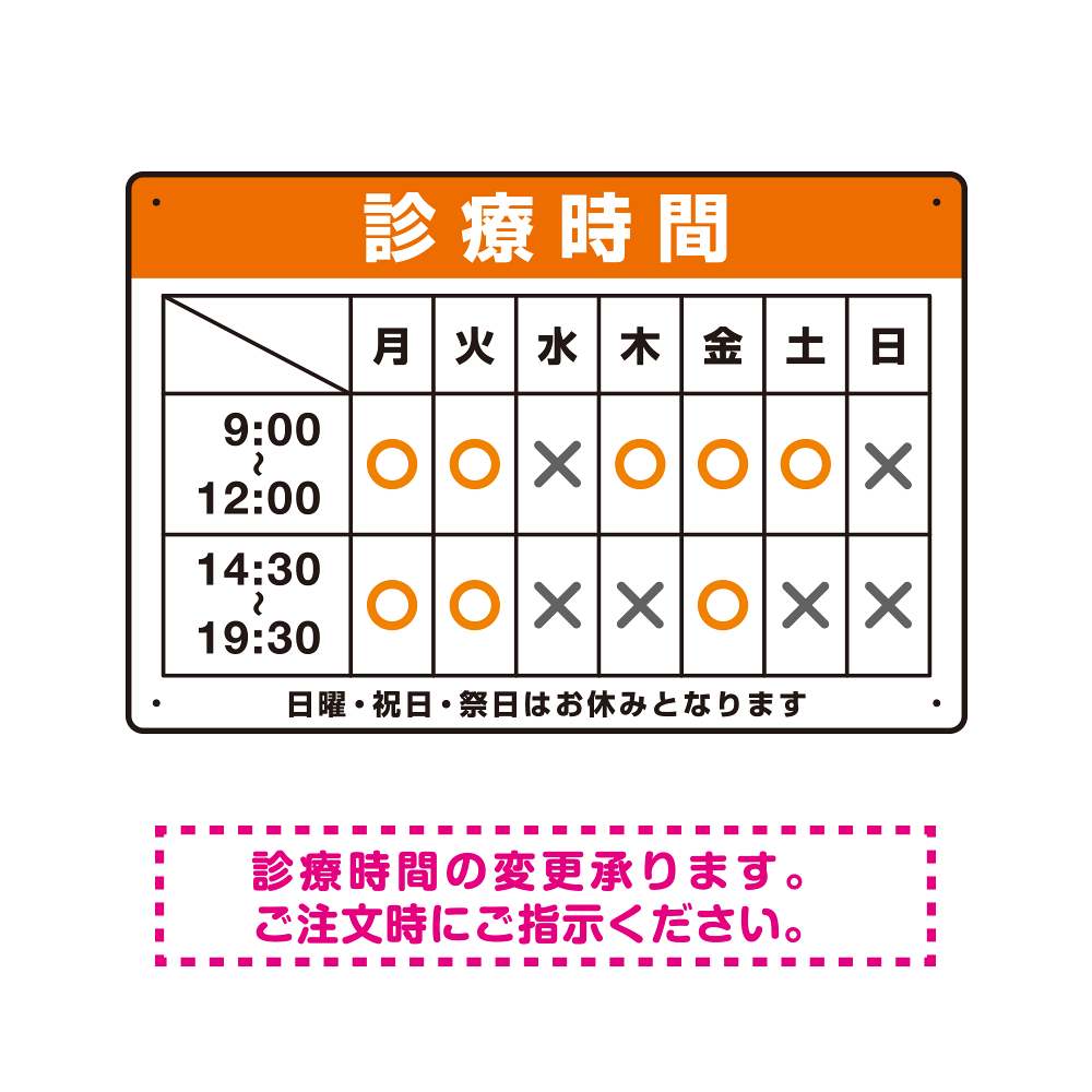 - 病院や歯科・クリニックに最適な診療時間案内デザインテンプレート看板。1から作ると高くなってしまう看板もテンプレートをご利用いただくことで安価に簡単にお作りいただけます。