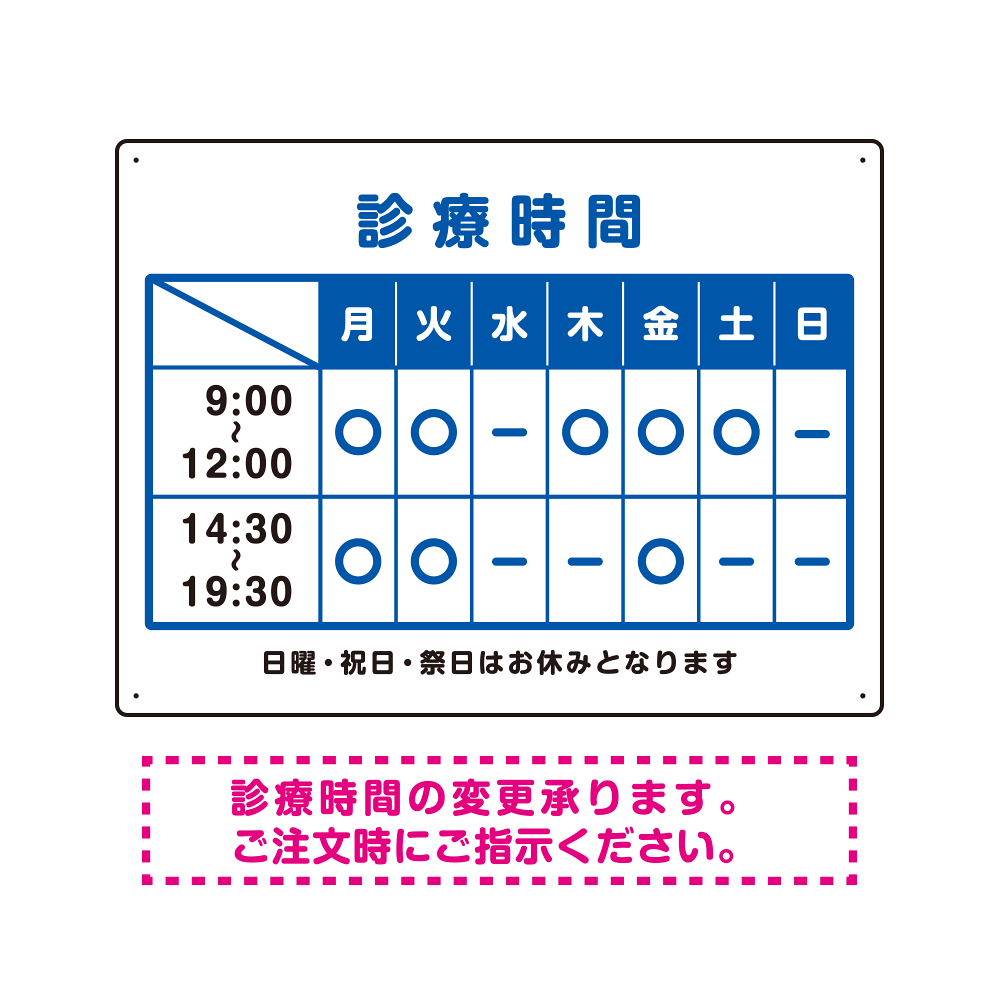 - 病院や歯科・クリニックに最適な診療時間案内デザインテンプレート看板。1から作ると高くなってしまう看板もテンプレートをご利用いただくことで安価に簡単にお作りいただけます。