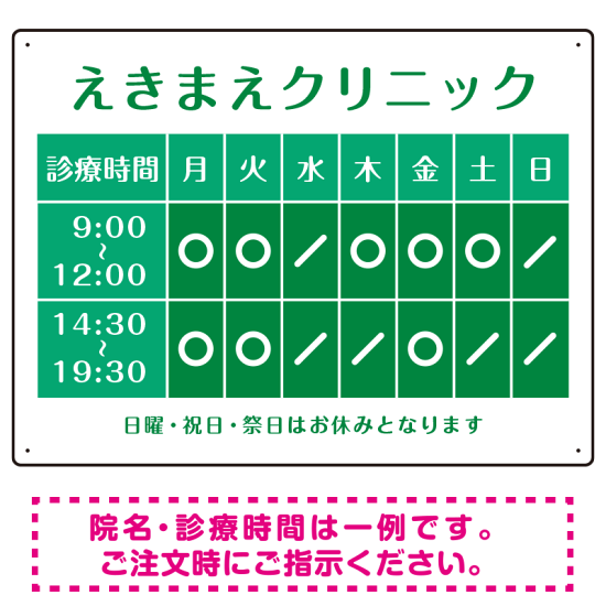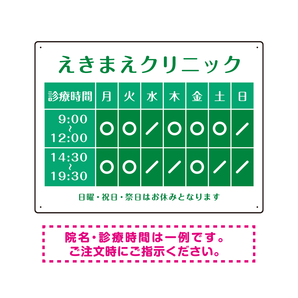 クリニック名付き診療時間案内 カラーデザイン 病院・クリニック向けプレート看板 グリーン W600×H450 エコユニボード