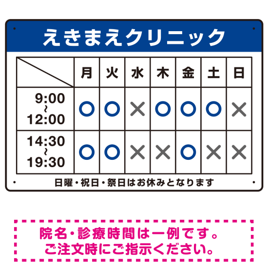 商品説明:クリニック名付き診療時間案内 色帯タイトル 病院・クリニック向けプレート看板 ブルー W450×H300 アルミ複合板