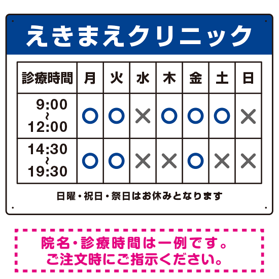 クリニック名付き診療時間案内 色帯タイトル 病院・クリニック向けプレート看板 ブルー W600×H450 エコユニボード