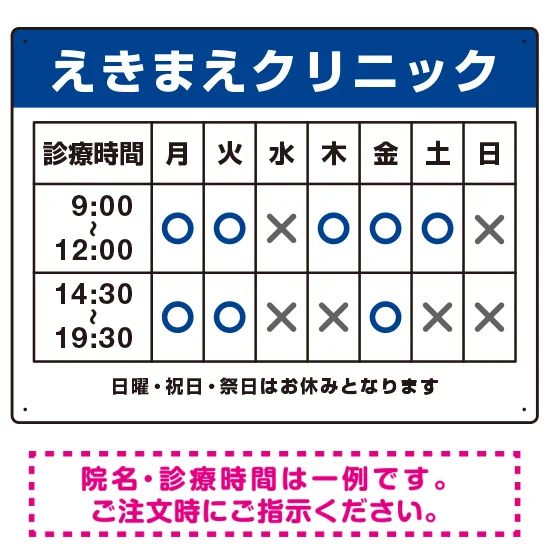 クリニック名付き診療時間案内 色帯タイトル 病院・クリニック向けプレート看板 ブルー W600×H450 エコユニボード の商品詳細