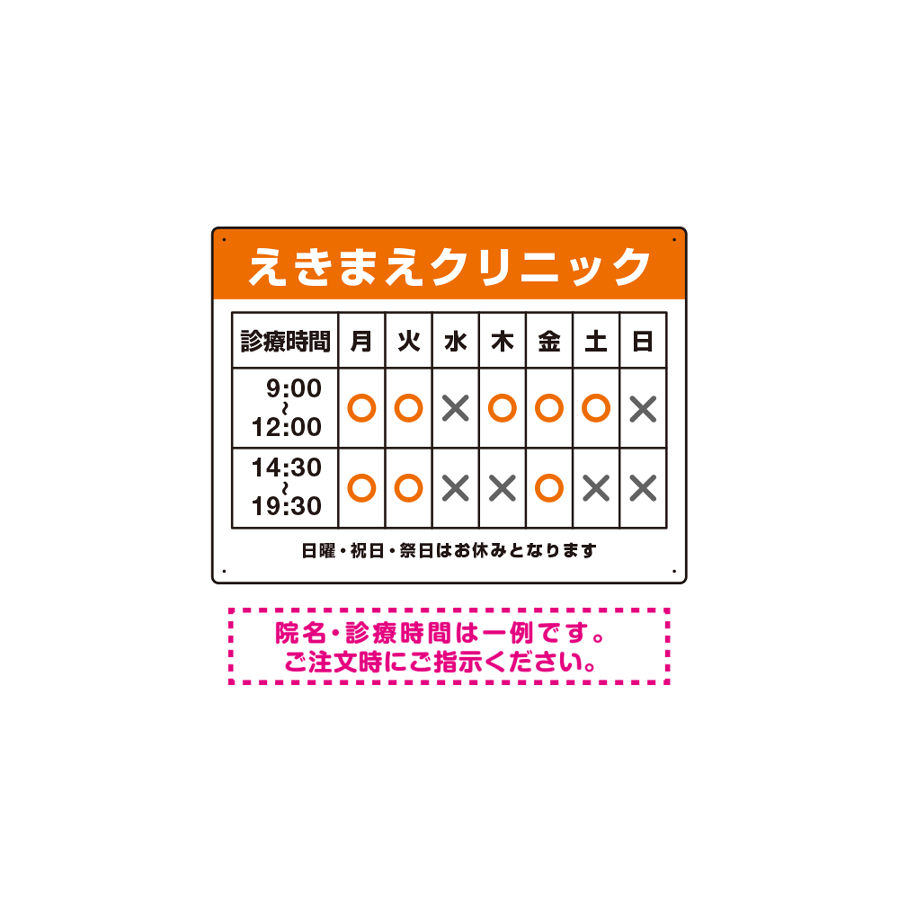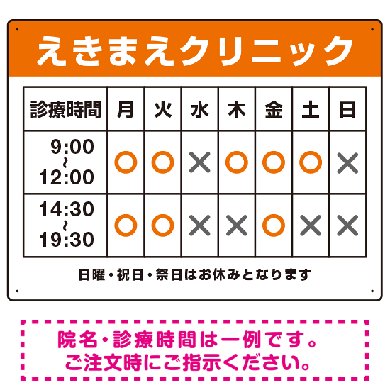 商品説明:クリニック名付き診療時間案内 色帯タイトル 病院・クリニック向けプレート看板 オレンジ W600×H450 アルミ複合板