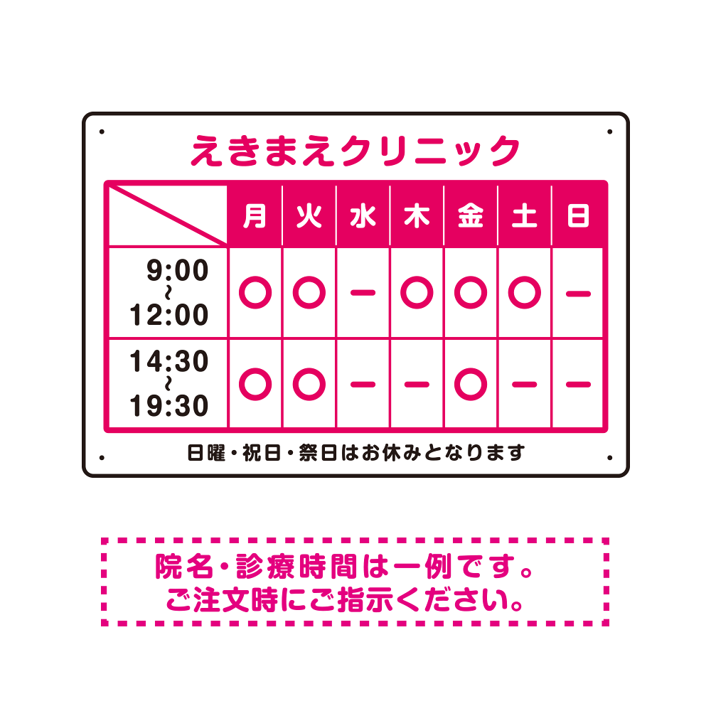 クリニック名付き診療時間案内 カラー文字・枠デザイン 病院・クリニック向けプレート看板 ピンク W450×H300 エコユニボード